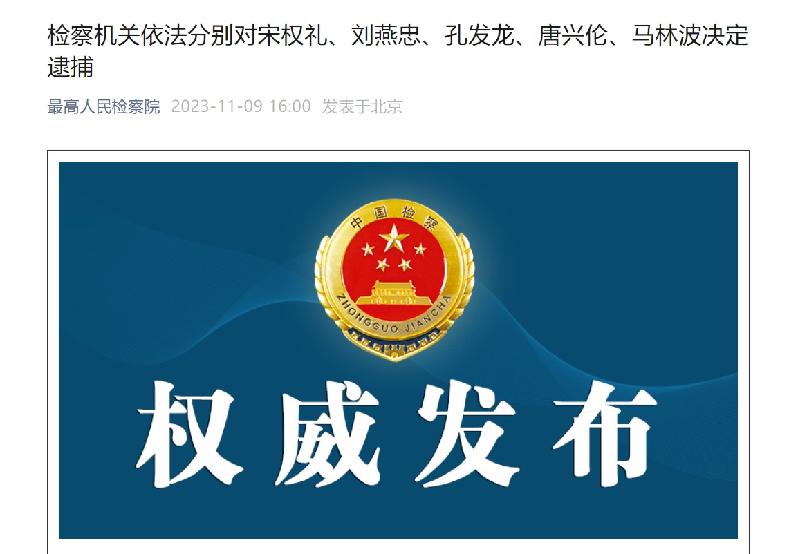 据最高人平易近查察院号11月9日动静,查察机关别离对宋权礼、忠、孔发龙、唐兴伦、马林波决定,5人均