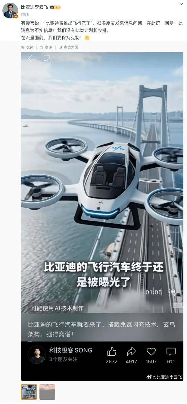 12月29日,比亚迪集团品牌及公关处总司理李云飞正在微博上发文,回应“比亚迪将推出飞翔汽车”的传言。他暗示,“良多伴侣发来消息问询,正在此同一答复:此动静为不实消息!我们没有此类打算和放置。正在流量面前,我们要连结胁制!”。