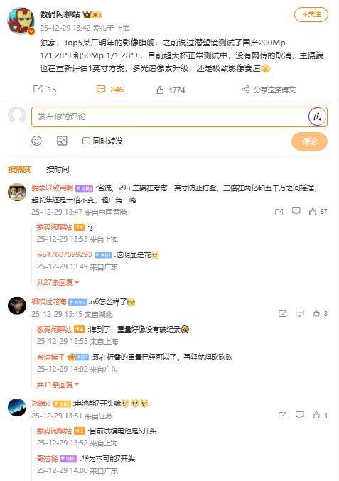 12 月 29 日,博从 数码闲聊坐 发文透露,Top5 某厂来岁的影像旗舰目前超大杯一般测试中,没有网传的打消,从摄端也正在从头评估 1 英寸方案,多光谱像素升级,仍是极致影像赛道。据博从分享,该机型此前曾测试了国产 200Mp 1/1。28± 和 50Mp 1/1。28± 镜头方案。连系评论区会商来看,博从此次爆料的机型为 Pura 90 系列,无望为 Pura 90 Pro+ / Pura 90 Pro Max(具体定名暂未发布)。有网友扣问新机的电池容量可否来到 7000mAh 级,博从暗示:“目前试模电池是 6 开首。”。